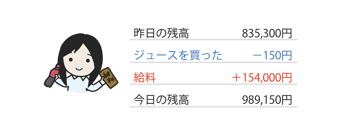 私たちは、コンビニでジュースを買って150円支払ったことを記録したいときには、家計簿を使います。家計簿は、お金を払ったらマイナス、お金をもらったらプラスで記録していきます。このような、『お金』が減ったか増えたかだけを考える簿記を単式簿記(たんしきぼき)といいます。