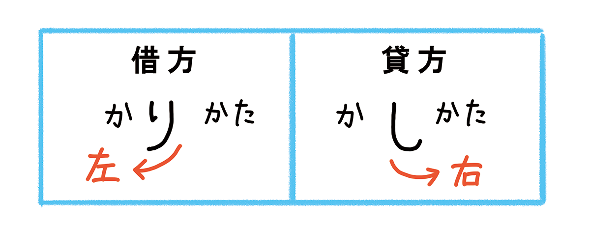 簿記では左側を『借方』、右側を『貸方』と言いますが、気にしなくて大丈夫です。もし仕事や試験問題で出てきたら、次の図で『貸方?ああ、右のことか』と思い出してください。