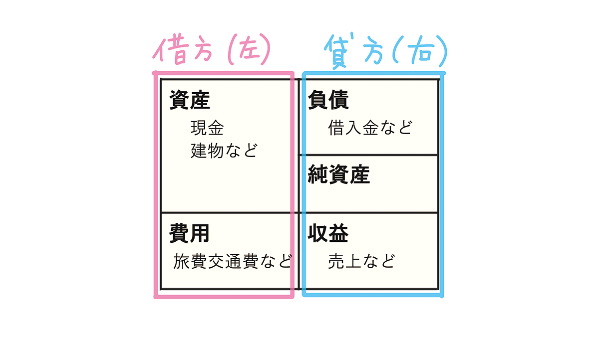 今回おさえていただきたいのは、5つの分類は、さらに左(借方)と右(貸方)に分けられるということです。